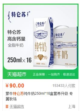 在某电商平台上,一箱250ml*16盒装的特仑苏,价钱为90RMB。如果以2升来计算的话,2L=45rmb;相当于9加币!