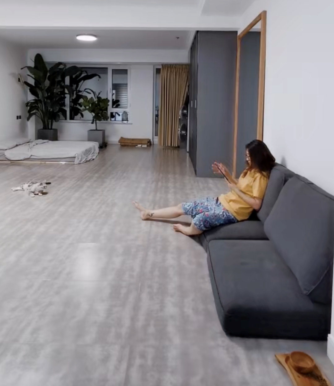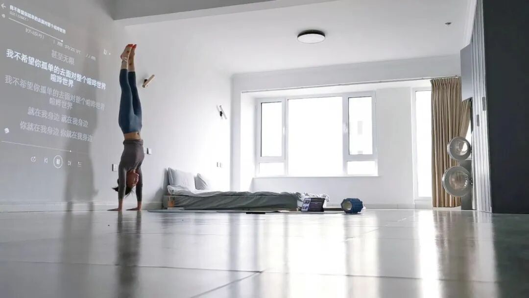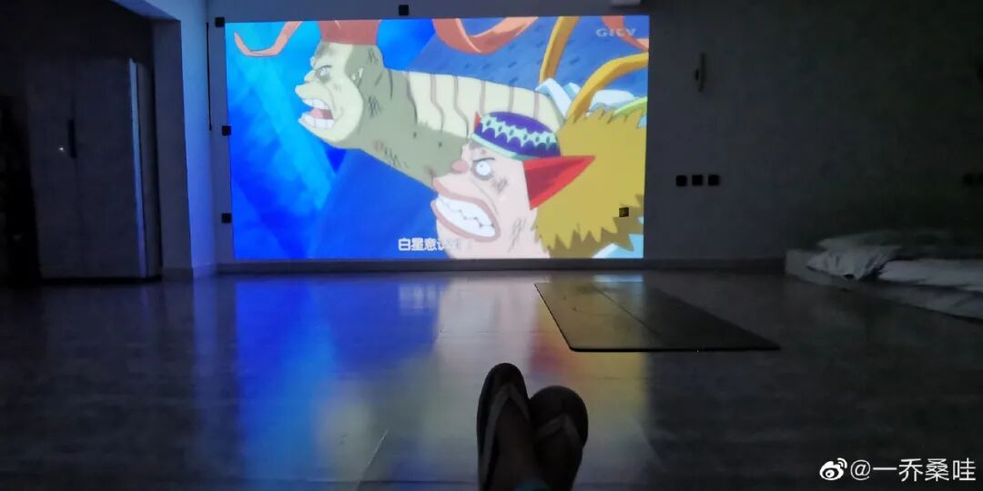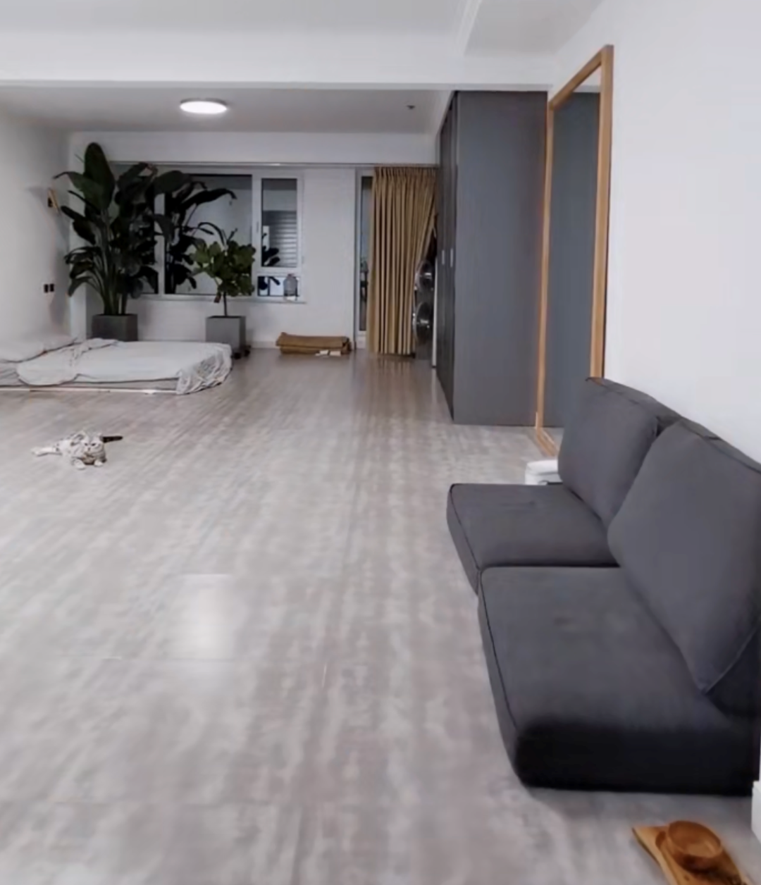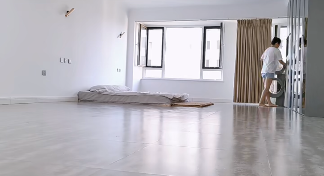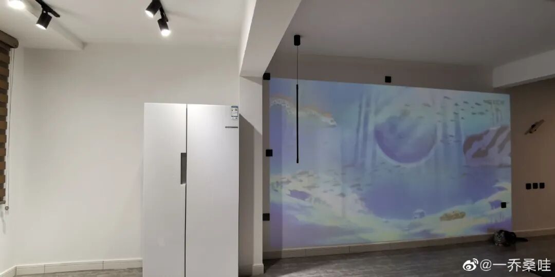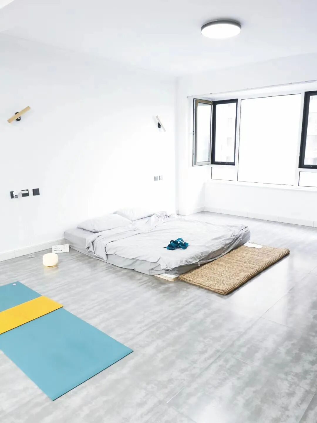在这个看似「空无一物」的家中,乔桑有了非常宽敞的空间去做瑜伽,还可以陪着猫咪一起满屋疯跑,累了就在大白墙上投影看动漫。