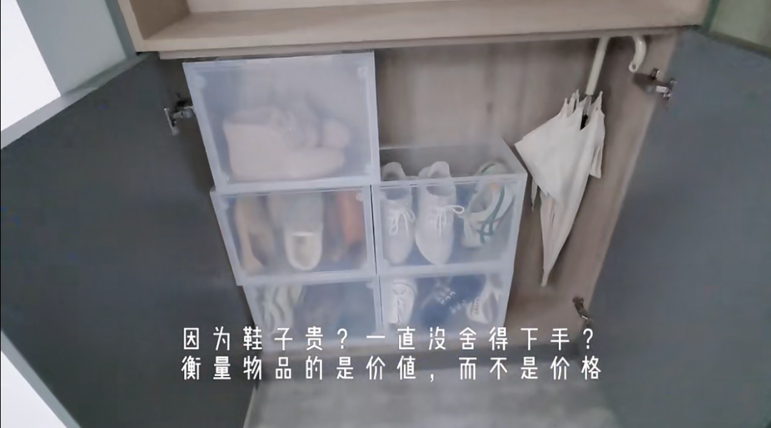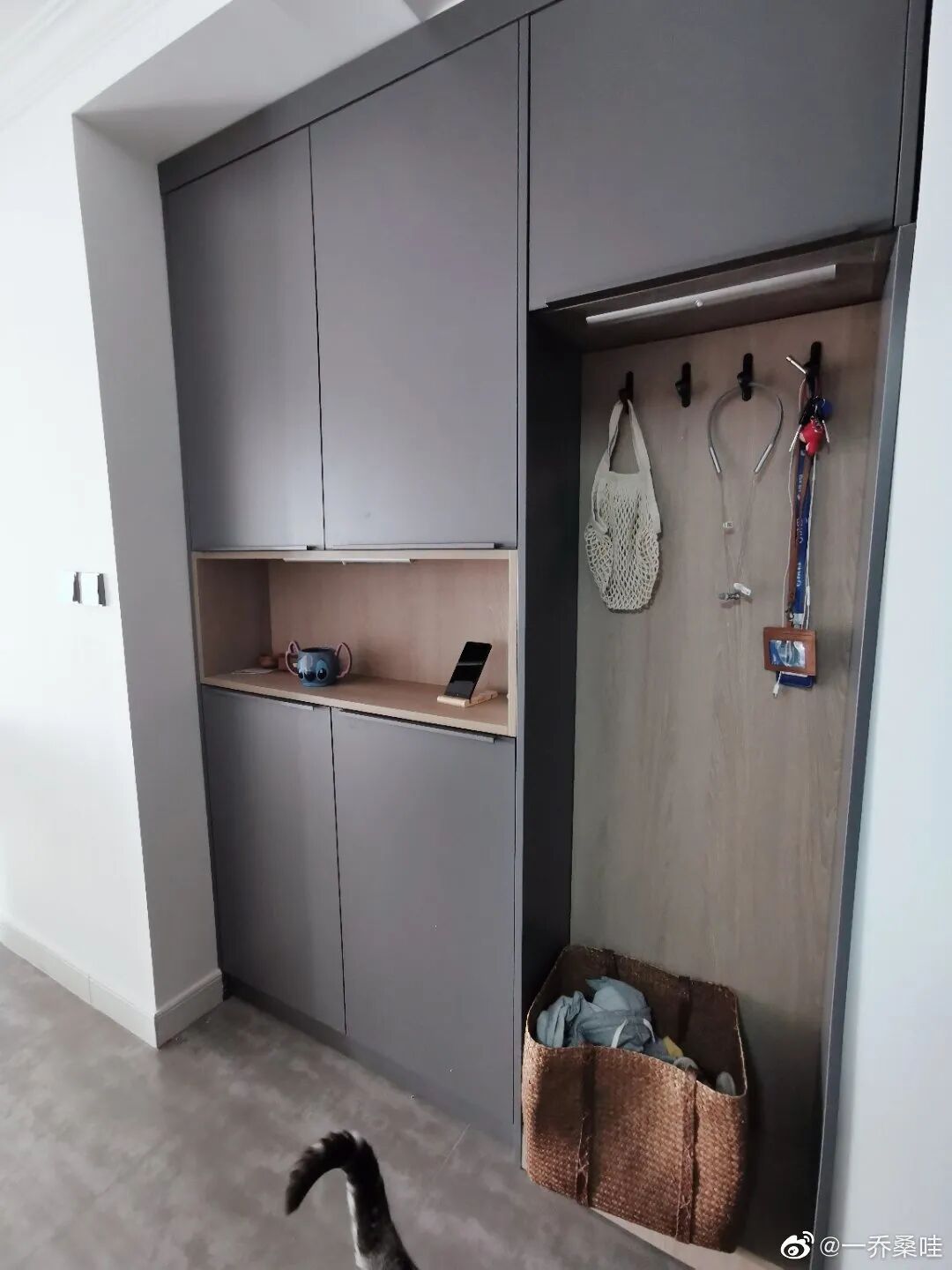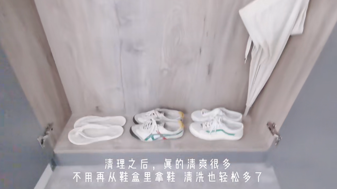 洗手间对面是和衣柜一起定制的鞋柜,里面装下了全部的鞋子,后来她还把鞋子再次断舍离,只留下最常穿、最舒适的款式。